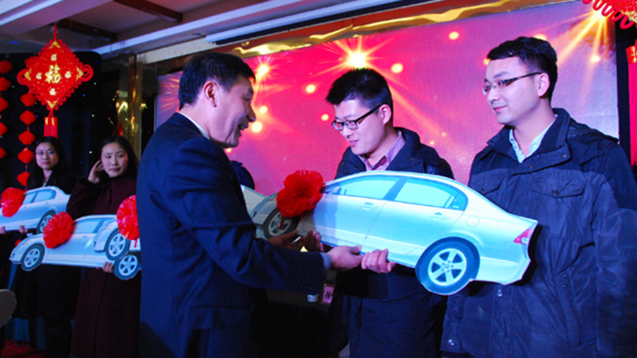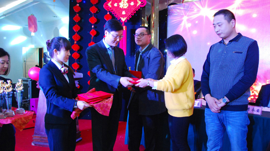年會由總結(jié)報(bào)告、表彰慶功、文藝演出、酒會活動等環(huán)節(jié)組成。年會現(xiàn)場,氣氛激情、熱烈、活躍。陳學(xué)民總經(jīng)理首先總結(jié)回顧了德源藥業(yè)2014年度的各項(xiàng)工作。徐金官副書記宣讀了公司2014年度優(yōu)秀員工的表彰決定,鄭家通副總經(jīng)理對每位受表彰的員工先進(jìn)事跡作了介紹。李永安董事長親自向2014年度業(yè)績突出的6個辦事處頒發(fā)了轎車模型,陳學(xué)民總經(jīng)理、范世忠副總經(jīng)理、徐金官副書記分別為楊海云等12名優(yōu)秀員工、3名優(yōu)秀管理者、2名銷售標(biāo)兵、4名銷售能手、2名銷售進(jìn)步者、1名生產(chǎn)操作能手、1名科技先進(jìn)工作者、1名質(zhì)量管理先進(jìn)工作者和2名安全先進(jìn)工作者頒發(fā)了獎杯和證書,優(yōu)秀員工代表?xiàng)詈T?、董超、李靜、宋明明分別上臺發(fā)表了獲獎感言。