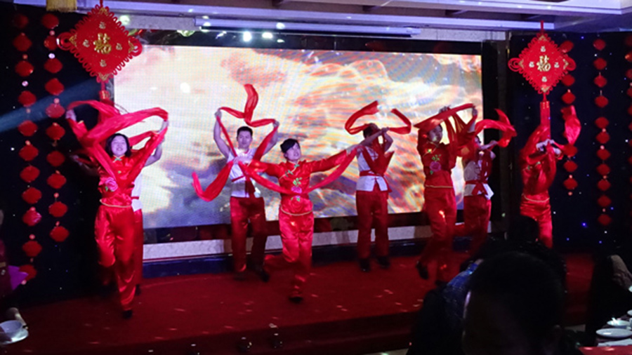 聯(lián)歡會由幸福、丁曄主持。其間穿插了舞蹈、武術(shù)、器樂等表演,整臺聯(lián)歡會的節(jié)目都是由員工和員工的子女表演,形式多樣,精彩紛呈,節(jié)目讓晚會高潮迭起,歌聲、掌聲、歡呼聲不時的在晚會場上蕩漾。 由市場部策劃表演的《幻影互動秀》,利用LED背景墻,將舞蹈剪影與背景畫面融合,創(chuàng)造了魔幻般的表演效果;車間員工劉桂林的兒子李承洋演奏的葫蘆絲曲《月光下的鳳尾竹》,帶來絲絲清爽;車間員工黃瑩、吳新會、苗小紅、張馨月、周艷紅表演的舞蹈《青花瓷》,展示了民族舞蹈的特有魅力;員工武海云兒子李昊洋的八極拳表演,動、靜結(jié)合,舒展大方。另外,員工王丹丹、葛丹、畢龍、薛婧還為大家?guī)砹恕禘vertime》、《愛情?!?、《情非得已》、《萬水千山總是情》等歌曲。