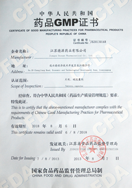 8月6日,接江蘇省食品藥品監(jiān)督管理局通知,經(jīng)現(xiàn)場(chǎng)檢查和審核批準(zhǔn),江蘇德源藥業(yè)有限公司固體制劑車間符合中華人民共和國(guó)《藥品生產(chǎn)質(zhì)量管理規(guī)范》(2010年修訂)要求,發(fā)給《藥品GMP證書(shū)》(證書(shū)編號(hào):JS20130168)。