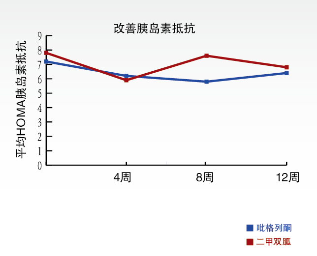 鹽酸吡格列酮與二甲雙胍皆具改善胰島素抵抗的效果,但二者的作用機制不同,二者的作用部位也有差別。吡格列酮主要促進(jìn)外周組織攝取葡萄糖,而二甲雙胍主要抑制肝糖輸出,故二者具有互補的降糖機制。“復(fù)瑞彤®”作用集中于代謝缺陷,改善了胰島素敏感性和β細(xì)胞功能。