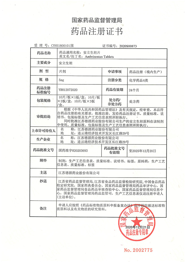安立生坦片適應(yīng)癥是肺動(dòng)脈高壓。肺動(dòng)脈高壓是一種極度惡性的罕見病,是由各種原因所引起的肺動(dòng)脈壓力持久增高。但由于近年來其發(fā)病率的節(jié)節(jié)攀升及醫(yī)患疾病認(rèn)知度的提高,其已成為漸受重視的一大類心血管疾病。安立生坦是由美國Myogen公司開發(fā)的一種內(nèi)皮素受體拮抗劑(ERA),后轉(zhuǎn)給葛蘭素史克公司,分別于2004年和2005年在美國和歐洲獲得孤兒藥地位,在中國于2010年10月獲得批準(zhǔn)。我公司于2018年6月,按照化學(xué)藥品4類注冊(cè)申報(bào)并獲受理(受理號(hào):CYHS1800101),2020年12月21日,國家藥監(jiān)局核準(zhǔn)并簽發(fā)了安立生坦片《藥品注冊(cè)批件》,且獲批后視同通過一致性評(píng)價(jià),表明我公司研發(fā)的安立生坦片質(zhì)量與療效與原研產(chǎn)品一致。