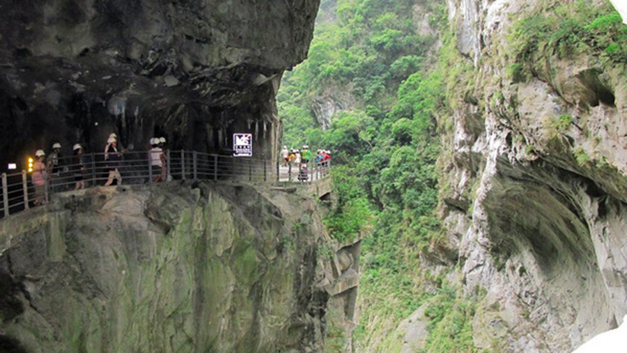 在太魯閣風(fēng)景區(qū),游客們走在先人開鑿的棧道上,邊上是萬丈懸崖。