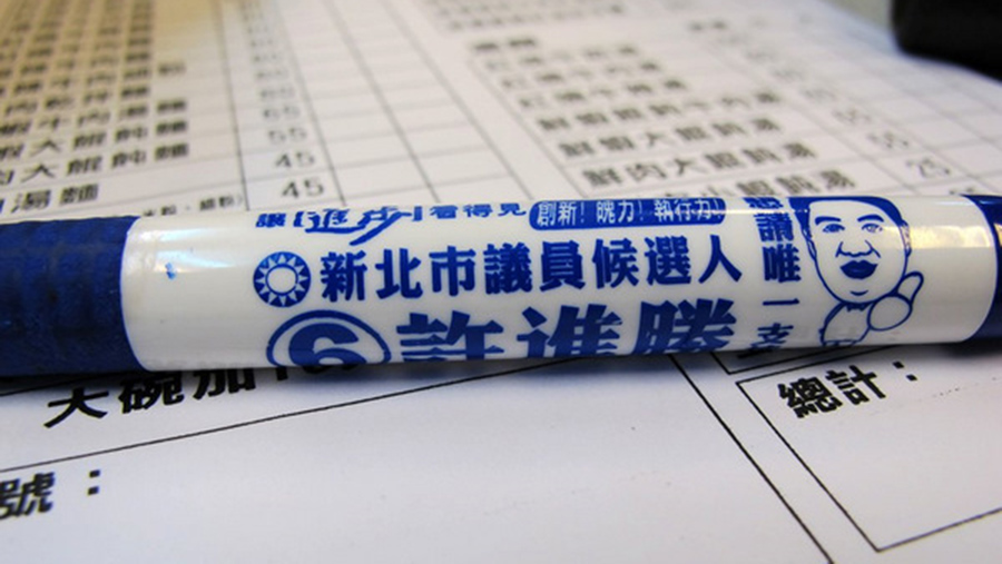 選舉人將自己的選舉廣告做到了小吃店的圓珠筆上。