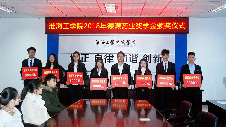 “德源藥業(yè)獎(jiǎng)學(xué)金”是公司于2016年開始在淮海工學(xué)院商學(xué)院、藥學(xué)院設(shè)立的獎(jiǎng)學(xué)金。三年來,公司共獎(jiǎng)勵(lì)品學(xué)兼優(yōu)的學(xué)生135人,捐助獎(jiǎng)金27萬元。