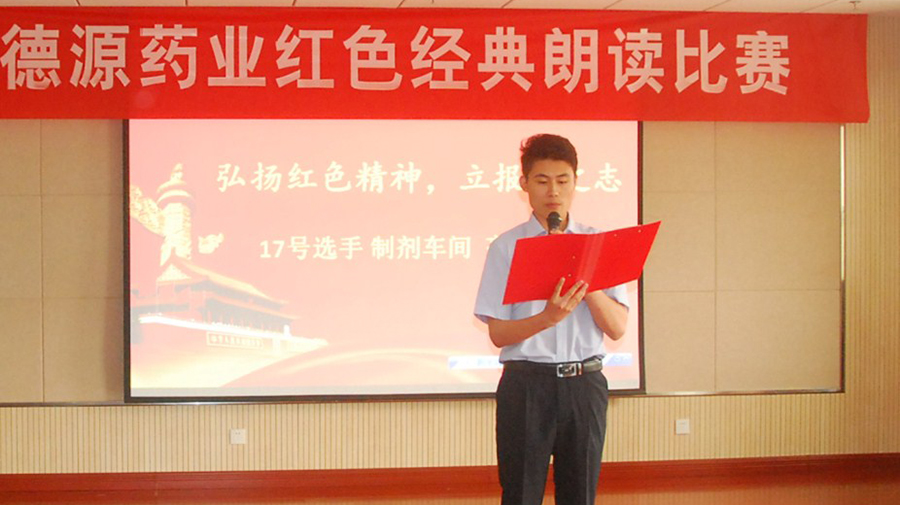 6月28日下午,“德源藥業(yè)紅色經典朗讀比賽”在公司會議室成功舉行。來自固體制劑車間、質量部、制造部、研究所、市場部、業(yè)務部等部門共計33名選手參加比賽。比賽邀請市委宣傳部孫宜志處長、恒瑞醫(yī)藥工會主席趙霞、中金瑪泰工會主席笪瑩、公司黨委副書記徐金官、公司人力資源行政總監(jiān)薛四明擔任評委。