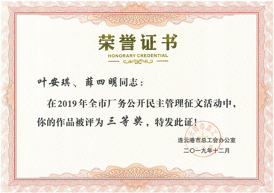 近日,市總工會為在2019年全市廠務公開民主管理征文活動中的獲獎作品頒發(fā)證書,我公司葉安琪、薛四明以公司開展廠務公開民主管理工作為實例撰寫的《民主管理是凝聚職工構(gòu)建和諧企業(yè)的重要途徑》被評為三等獎。