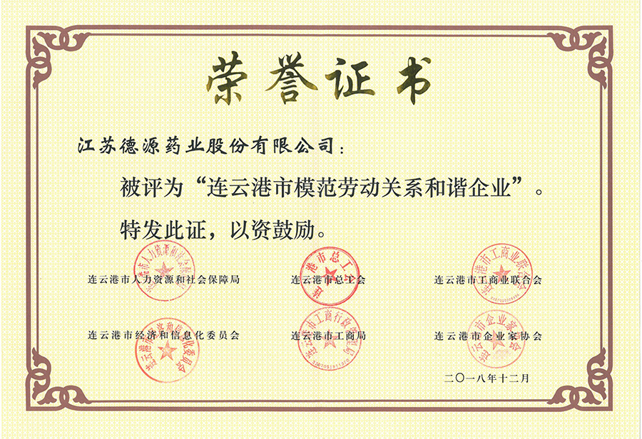 長(zhǎng)期以來(lái),德源藥業(yè)堅(jiān)持以勞動(dòng)關(guān)系長(zhǎng)期和諧穩(wěn)定為目標(biāo),誠(chéng)實(shí)守信,依法經(jīng)營(yíng),深入開展和諧勞動(dòng)關(guān)系創(chuàng)建活動(dòng),切實(shí)維護(hù)職工的合法權(quán)益,實(shí)現(xiàn)了企業(yè)與職工的共同發(fā)展與成長(zhǎng),獲得了上級(jí)主管部門的多次表彰。自2012年我市開展這項(xiàng)活動(dòng),公司已連續(xù)7年獲得此項(xiàng)榮譽(yù),并已于2014年獲得省模范勞動(dòng)關(guān)系和諧企業(yè)榮譽(yù)稱號(hào)。