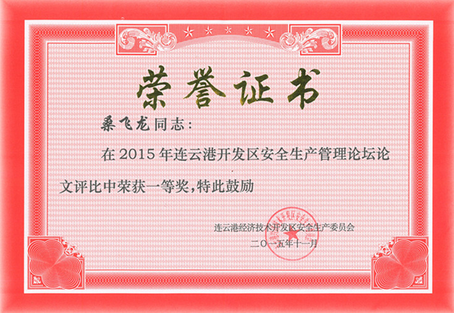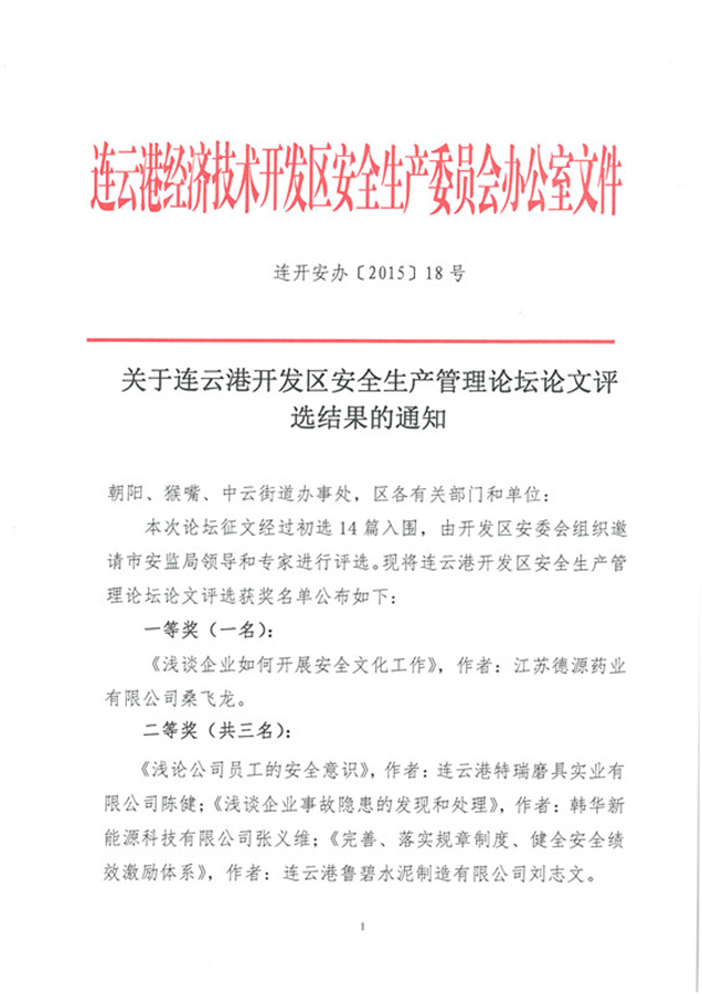 長(zhǎng)期以來(lái),我公司始終秉承安全發(fā)展的原則,積極貫徹執(zhí)行“安全第一”的生產(chǎn)方針。今年,我公司以實(shí)施安全標(biāo)準(zhǔn)化工作為基本,將企業(yè)安全生產(chǎn)工作與企業(yè)文化工作相結(jié)合,著重提升員工的安全素養(yǎng),營(yíng)造一種全員參與的安全文化氛圍。日前,在第五屆“連云港經(jīng)濟(jì)技術(shù)開(kāi)發(fā)區(qū)安全生產(chǎn)管理論壇”論文評(píng)比中,我公司桑飛龍同志撰寫的《淺談企業(yè)如何開(kāi)展安全文化工作》一文,獲得一等獎(jiǎng)。