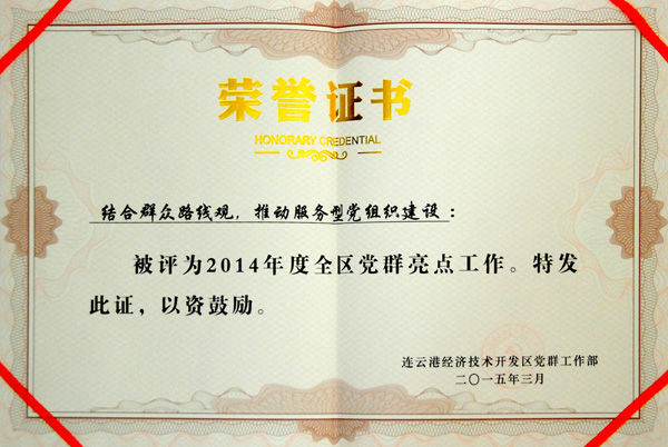 2015年3月6日,連云港經(jīng)濟技術(shù)開發(fā)區(qū)黨工委召開黨建暨群團工作會議。會上,我公司被評為2014年度開發(fā)區(qū)黨建工作先進單位,連續(xù)多年獲此殊榮。公司開展的“結(jié)合群眾路線觀,推動服務(wù)型黨組織建設(shè)”被評為2014年度開發(fā)區(qū)基層黨群亮點工作,同時受到了表彰。另外,公司“堅持群眾路線 嚴肅工作作風全面構(gòu)建德源黨建服務(wù)工作新模式”在大會上作為書面材料進行了交流。