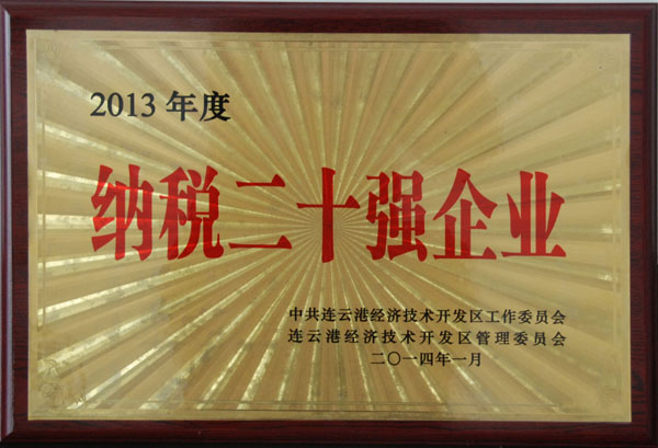 在2014年1月18日連云港經(jīng)濟(jì)技術(shù)開發(fā)區(qū)召開的2013年度總結(jié)表彰暨2014年工作部署大會上,開發(fā)區(qū)工委、開發(fā)區(qū)管委會聯(lián)合對全區(qū)經(jīng)濟(jì)社會發(fā)展及專項工作先進(jìn)單位和先進(jìn)個人進(jìn)行了表彰。我公司自2010年以來第4次蟬聯(lián)“開發(fā)區(qū)納稅20強(qiáng)企業(yè)”榮譽(yù)稱號,受到政府表彰。