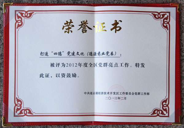 2月23日,連云港經(jīng)濟技術開發(fā)區(qū)黨工委召開黨建暨群團工作會議。會上,我公司以“德”為核心的“四德”黨建文化被開發(fā)區(qū)黨群工作部評為2012年度全區(qū)黨群亮點工作。